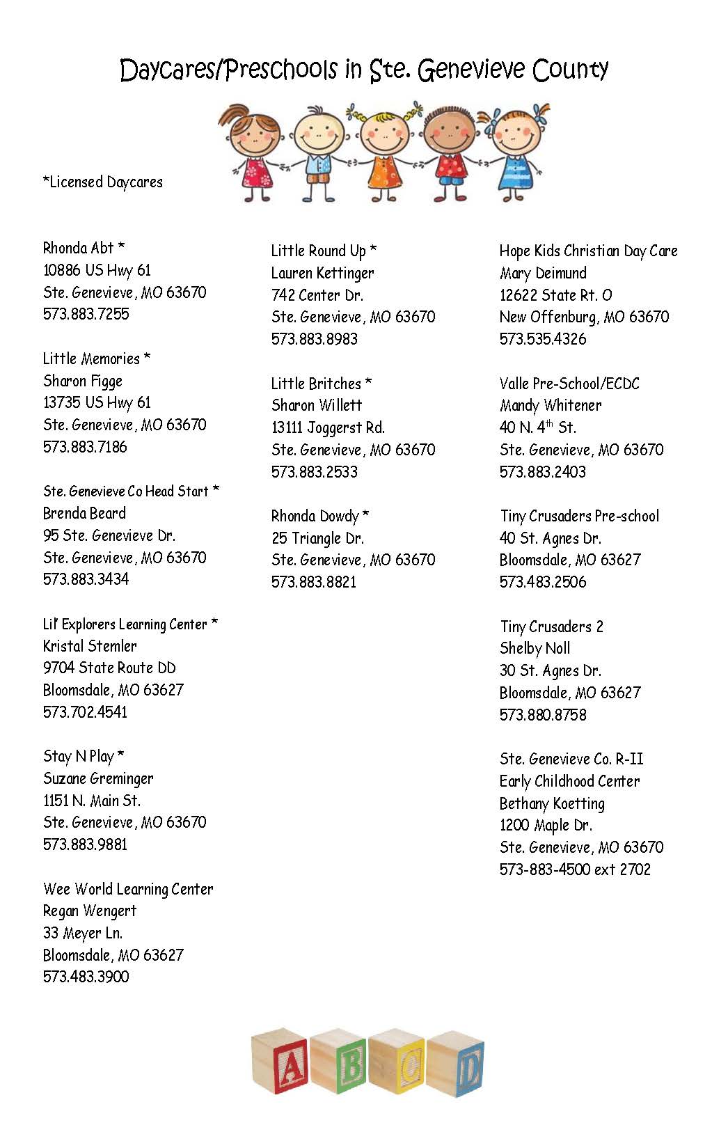 - For a list of local Daycares, please click HERE